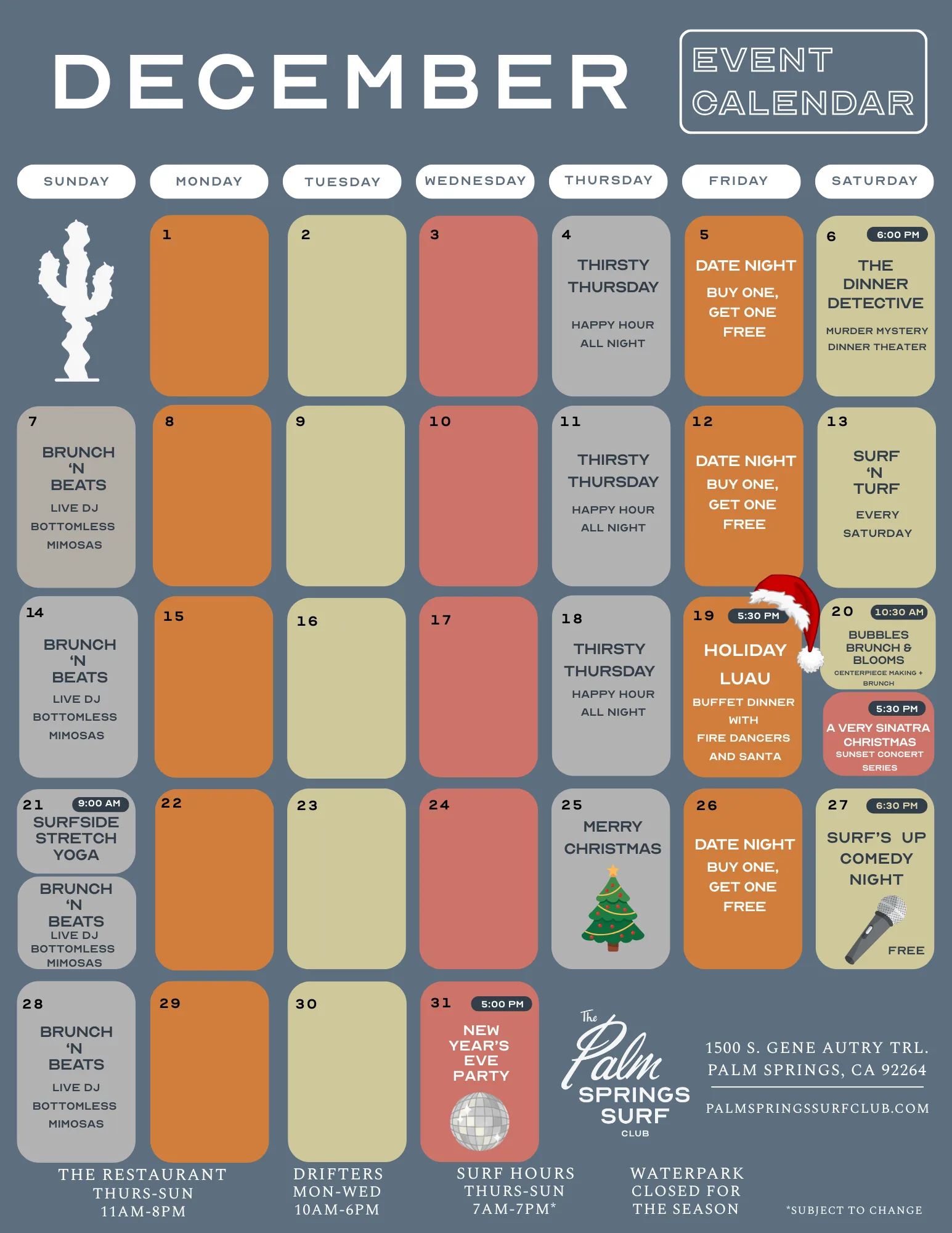 Appropriate swimwear is required and determined by The Palm Springs Surf Club Management. No pants, visible undergarments, transparent attire, denim, or inappropriate and/or vulgar attire is allowed.